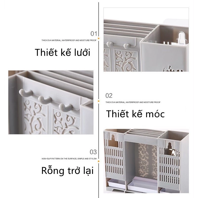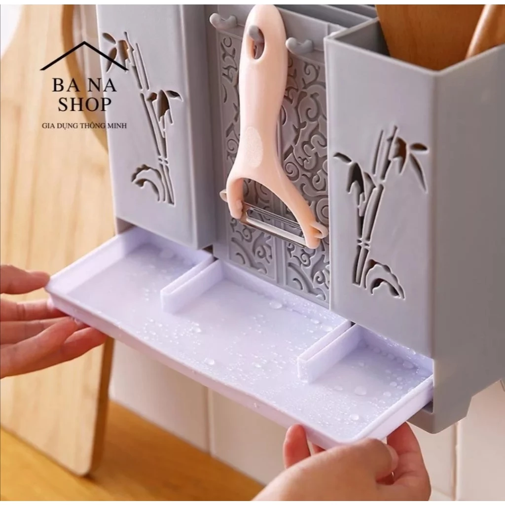 Kệ cắm dao đũa muống kéo đa năng+ Để bàn hoặc dán tường đều tiện+ Thiết kế với khay thoát nước tháo rời, giúp nhà bếp khô ráo sạch sẽ+ Để đồ gọn gàng.+ Thiết kế thẩm mỹ, sang trọng